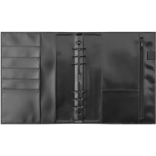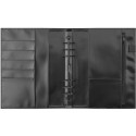 Klaff til lukking og glidelåslomme på innsiden - Penneholder og kredittkortlommer - Innbundet i sort kunstskinn - 6 ringer ø 30 mm - Format: 185 x 235 mm