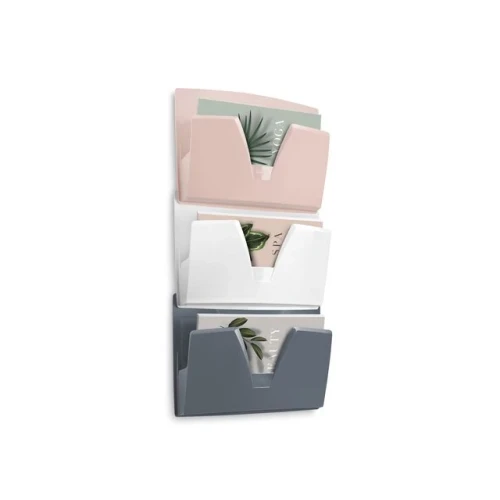 Flerfargede veggmonterte mapper for sortering av post eller andre dokumenter. Rommer dokumenter på opptil 24 x 32 cm. Utsparinger på sidene for å sette inn svært store formater (A3+), tegnerør osv. Bred V-formet åpning for enkel tilgang til innholdet. Mappene kan henges i klynger eller monteres separat på veggen (beslag følger med). - Tåler en belastning på 2,5 kg i en enkelt veggmontert mappe, og 5,5 kg totalt når 3 mapper henges sammen. - Laget av: slitesterk PS, 33% resirkulert*, 100% resirkulerbar - Dim. på 1 mappe: 361 x 86 H 270mm - Dim. på 3 mapper når de henges sammen: 361 x 86 H 715mm - Assorterte farger: Powder Pink, Arctic White, R-Storm Grey*