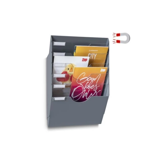 Effektiv vegghengt brosjyreoppbevaring med flere rom! CEP brosjyrestativ med 6 rom og avtakbare skillevegger gir fleksibel oppbevaring. Festes sikkert til enhver metalloverflate med sterke magneter. Perfekt for tykke dokumenter opptil 24 x 32 cm, med en kapasitet på opptil 7 kg. Laget av motstandsdyktig, resirkulert plast. - Fleksibel oppdeling: 2 til 6 rom - Kraftige magneter, ingen behov for boring - Rommer tykke dokumenter opptil 24 x 32 cm - Laget av 60 % resirkulert plast