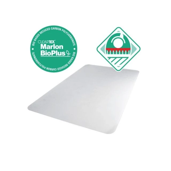 Stolmatten, laget av polykarbonat, inneholder 89% ikke-fossilt, bio-sirkulært materiale. Den er produsert med 100% fornybar energi og er fri for ftalater og giftige materialer, og med sin gripper-bakside er den optimal for bruk på tepper, gir gulvbeskyttelse og en stabil base for stolen. Med målene 89 x 119 cm gir stolmatten tilstrekkelig dekning og tilpasses forskjellige stolstørrelser og former. Stolmatten er 100% gjenvinnbar, noe som støtter bærekraft ved å minimere avfall og oppmuntre til resirkulering.