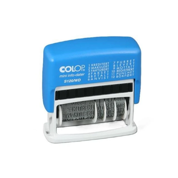 Stempelet Mini-Info-dater S120/WD med innebygd stempelpute kombinerer tekst og dato Brukeren kan selv velge mellom dato og ett av de følgende ordene: kreditert, makulert, fakturert, fakset, betalt, anvist, purret, levert, mottatt, registrert, punchet, og bokført. Med utvalget mulige ord har stempelet en rekke bruksområder. Datoen er i dag/måned/år format. Stempelet har innebygd stempelpute og årstall for 12 år. Det hjelper deg å holde oversikt over viktige dokumenter. - Stempel med både tekst og dato - Tekst og dato på èn linje - 12 ulike tekster - Bokstav- og tallhøyde 4mm - Tydelige avtrykk