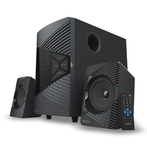 Creative SBS E2500 is a high-performance 2.1 speaker system that delivers rich, bold audio through a wide array of connectivity options. Stream wirelessly via Bluetooth®, listen to your favorite FM radio channels, or play directly from any USB devices! For wired connectivity, connect via the available 3.5 mm AUX-in jack. You can also easily access music playback and audio settings directly on the speakers, and even access the different EQ presets via the included wireless infra remote control. The Creative SBS E2500 is the perfect choice for your audio entertainment needs.
