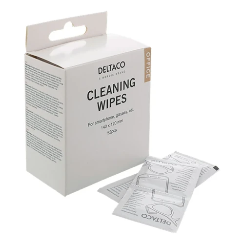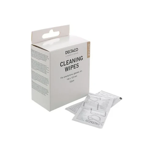 DELTACO Våtservietter til kontor for smarttelefon/briller/kamera/speil, 140x120mm. - Inneholder 52 våtservietter - Størrelse: 140x120mm - Farge: hvit