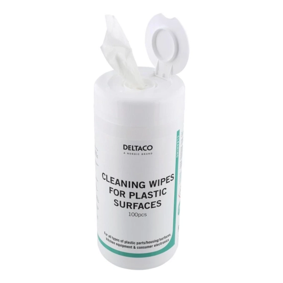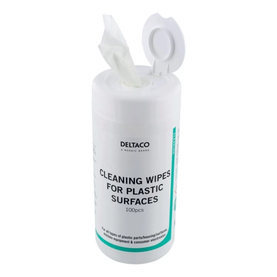 DELTACO våtservietter for rengjøring av plastoverflater. - Inneholder 100 store våtservietter - Biologisk nedbrytbare - Farge: hvit