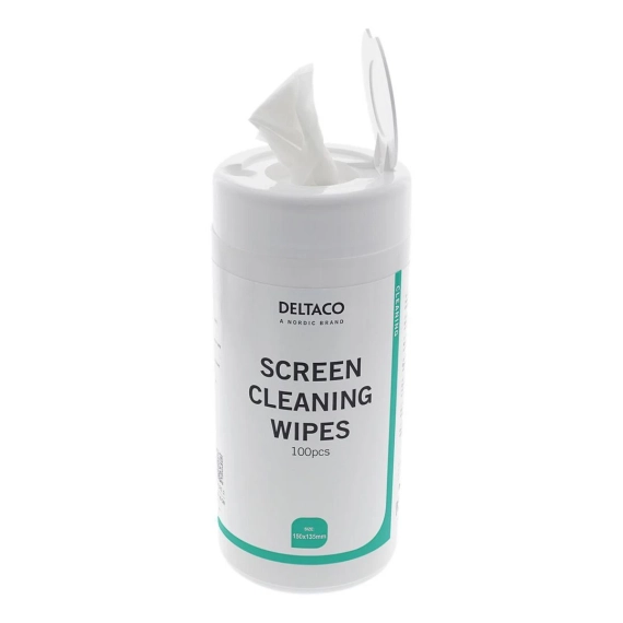 DELTACO våtservietter for rengjøring av skjermer. - Inneholder 100 store våtservietter - Alkoholfri - Biologiskt nedbrytbar - Farge: hvit