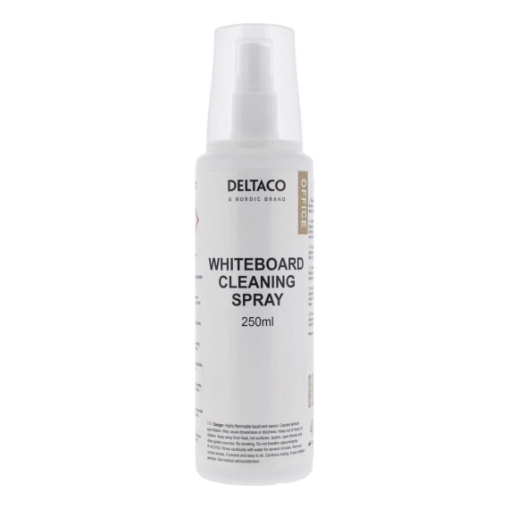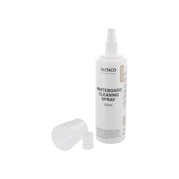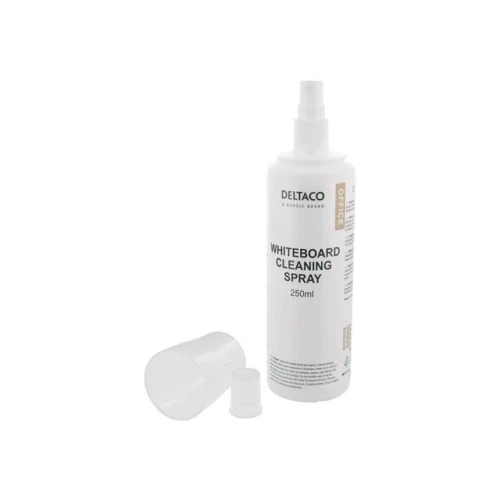 DELTACO OFFICE Whiteboard rensespray, 250ml, hvit. Fjern spor av tusj og andre vanskelige flekker effektivt. Fjern spor av tusj og andre vanskelige flekker effektivt. Spray på en ren, tørr klut og bruk kluten for å rense whiteboard. - Mål (BxDxH): 51x51x192mm - Vekt: 247g