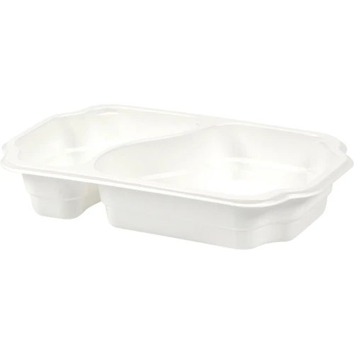 Pakk inn rester som kundene kan ta med hjem i denne Duni Take-Away-beholderen for oppbevaring av mat med inndelte seksjoner. Oppbevar rester eller send ut matleveranser i denne Duni Take-Away-beholderen for oppbevaring av mat. De fraskilte seksjonene holder maten atskilt for et tiltalende måltid, mens den slitesterke plastkonstruksjonen håndterer mikrobølgeovn og kjøleskapstemperaturer fra -20 til 120 grader celsius. Denne Duni Take-Away-beholderen for oppbevaring av mat leveres i et sett med 246, noe som gjør den til et utmerket alternativ for servering på sykehus og pleiehjem samt til hjemlevering. - Server eller oppbevar hele måltider i én beholder - Inndelt i seksjoner for å holde retter atskilt - Solid konstruksjon som ikke sprekker - Farge: Hvit - Beholderen måler 250 x 159 x 45mm