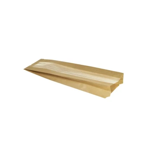 Baguettepose med vindu for transportering og takeaway. Brun papirpose, egnet for tørre matvarer som bakerprodukter. Perfekt for bakerier og caféer med servering og salg av ferske baguetter og andre brødvarer, og til innpakning av ferdigsmurte baguetter eller sandwicher. Praktisk pose for dagligvarebutikkenes selvbetjeningsdisker der kundene kan velge sine egne baguetter. Holder brødet ferskt og sprøtt på vei til kunden ved catering og takeaway. Papiret bidrar til å bevare sprøheten i baguetten, og det gjennomsiktige vinduet i hele posens lengde gir en god produktpresentasjon. - Materiale: Papirpose med PLA-vindu - Egnet for kald bruk, kjøleskap - Mål (LxBxH): 370x100x50mm