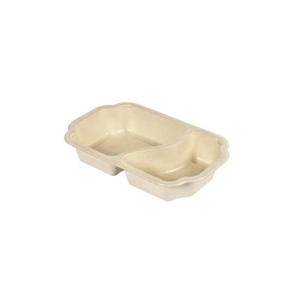 To-roms forseglbar form. Laget av fornybar bagasse og kombinerer ytelse, bærekraft og stil i ett. Matemballasje for pakking, oppbevaring, transport og takeaway. Formene er laget av fornybare sukkerrørfibre. Den tynne lamineringen med høy barriere resulterer i 90 % mindre plast sammenlignet med konvensjonelle brett, og gjør bagasseserien egnet for MAP (Modified Atmosphere Packaging). De slitesterke matbegrene er egnet for både varme og kalde retter, inkludert fuktige, fete og tørre matvarer. De tåler kjøleskap, fryser og mikrobølgeovn. Formene kan forsegles i Duniform-maskiner, noe som gjør det enkelt å transportere, lagre og varme opp måltider. Matformene med to rom holder matvarene adskilt, slik at teksturen og friskheten til hver enkelt komponent bevares. Dette gir en bedre spiseopplevelse, da maten ser mer innbydende ut og smaker som den skal. - Materiale: Bagasse med PE/EVOH-laminering - Mål: 250 x 159 x 45mm - Volum: 625/360ml, totalt 985ml - Antall rom: 2 - Farge: Brun - Varmebestandighet: Kald bruk, varmt innhold, mikrobølgeovn - Kuldebestandighet: Kjøleskap, fryser