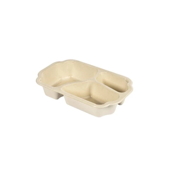 Tre-roms forseglbar form. Laget av fornybar bagasse og kombinerer ytelse, bærekraft og stil i ett. Matemballasje for pakking, oppbevaring, transport og takeaway. Formene er laget av fornybare sukkerrørfibre. Den tynne lamineringen med høy barriere resulterer i 90 % mindre plast sammenlignet med konvensjonelle brett, og gjør bagasseserien egnet for MAP (Modified Atmosphere Packaging). De slitesterke matbegrene er egnet for både varme og kalde retter, inkludert fuktige, fete og tørre matvarer. De tåler kjøleskap, fryser og mikrobølgeovn. Formene kan forsegles i Duniform-maskiner, noe som gjør det enkelt å transportere, lagre og varme opp måltider. Matformene med tre rom holder matvarene adskilt, slik at teksturen og friskheten til hver enkelt komponent bevares. Dette gir en bedre spiseopplevelse, da maten ser mer innbydende ut og smaker som den skal. - Materiale: Bagasse med PE/EVOH-laminering - Mål: 250 x 159 x 48mm - Volum: 540/340/180ml, totalt 1060ml - Antall rom: 3 - Farge: Brun - Varmebestandighet: Kald bruk, varmt innhold, mikrobølgeovn - Kuldebestandighet: Kjøleskap, fryser