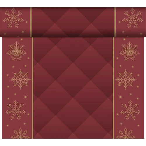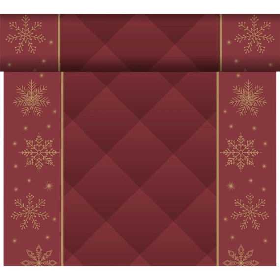 Kuvertløper på rull i serien Rhombus, et fengslende design med gylne romber og delikate snøflak satt mot et rikt rødt bakteppe. Med sin elegante stil i rødt og gull, bringer disse kuvertløperene glamour til enhver feiring og anledning. Perforeringen gjør bordløperne enkle å bruke. Hver rull inneholder 20stk løpere a 1,20cm lengde og passer til alle bord. Har du et fint bord som skal dekkes til, men ikke skjules, er tètè à tètè den perfekte løsning. Løperne er også flotte over en heldekkende duk. Dunicel® er et unikt borddukmateriale med fin tyngde, som er ideelt til kuvertløpere. Dekk et elegant og stemningsfullt bord med Rhombus bordeaux bordløpere Beskytter ditt bord eller din duk En rull inneholder 20 løpere med målene 40x120cm