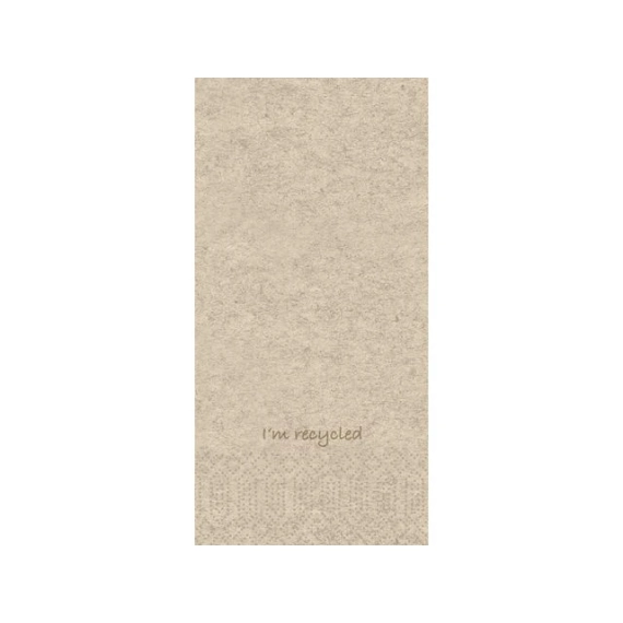 Stor og myk tolags serviett, ferdig brettet til kuverten. Fremstilt av gjenvunnet papir.Serviett av resirkulert papir. Den kommer i en varm, naturbrun farge med teksten: 'I'm recycled', samt en preget kant. En rustikk stil som passer godt til både lunsj- og middagsservering, for bistroer og restauranter i tillegg til kaféer og bakerier. Perfekt bretting hver gang. Servietten er ferdig brettet 1/8. Den tar liten plass på bordet, og gjør borddekkingen rask og effektiv når du serverer mange retter i løpet av begrenset tid. Serviettene leveres i stor forpakning og er en tidsbesparende og praktisk løsning for hoteller, restauranter og cateringfirmaer.Serviett i resirkulert papir Kompakt størrelse for enkel borddekking i store serveringsmiljøer Mål serviett: 40x40cm, brettet 1/8 Antall lag: 2