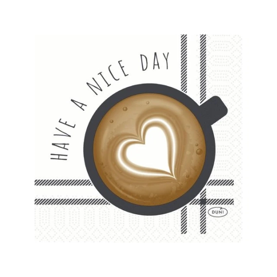 Duni serviett 24x24cm. Passer til fingermat og kaffe mv. Materialkvalitet: tissue, 3 lag. Hovedfarge: hvit. Påtrykket tekst: :Have a nice day: