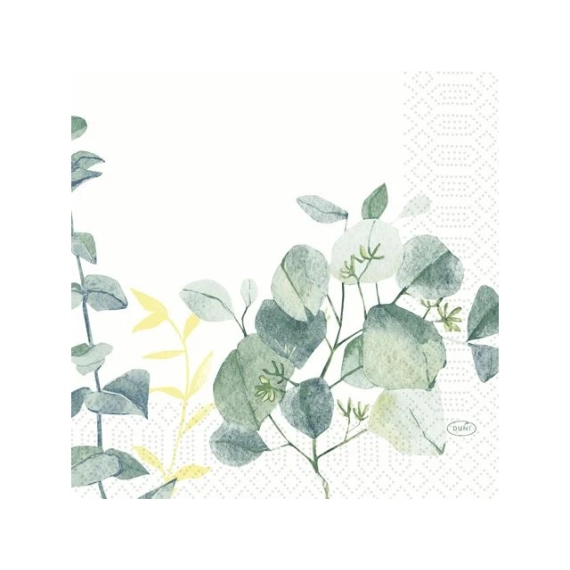 Praktisk serviettstørrelse til uformelle anledninger. 3 Lags og brettet ¼. Det funksjonelle valget for uformelle frokost-, lunsj- og mellommåltider. Jo flere lag, desto bedre holdbarhet. - Kvalitet: Tissue-serviett, 3 lag. - Brettet 1/4 - Farge: hvit med grønne blader - Mål serviett: 33x33cm - Mål forpakning(LxBxH): 16,5x16,5x5,8cm.