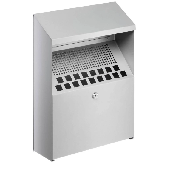 Praktisk askebeger av metall med ripefast overflate av polyester som er velegnet for utendørs veggmontering. Begeret bør monteres under tak eller utheng. Har låsbar tømmingsluke med 2 nøkler og en innvendig beholder som er enkel å tømme. Har en kapasitet på 4 liter.