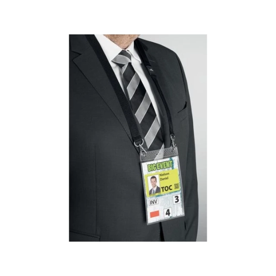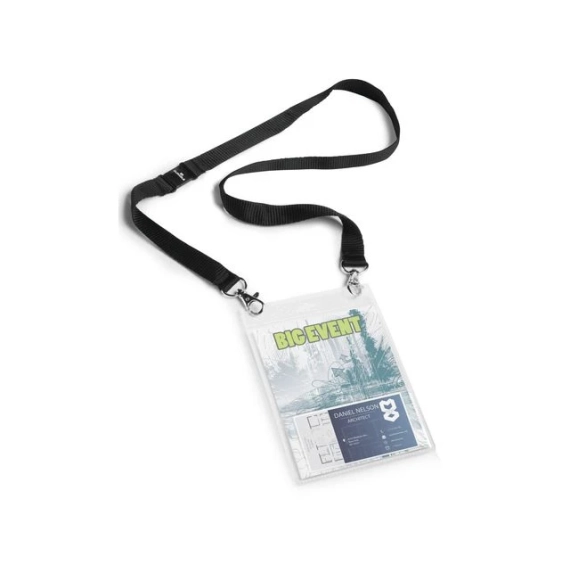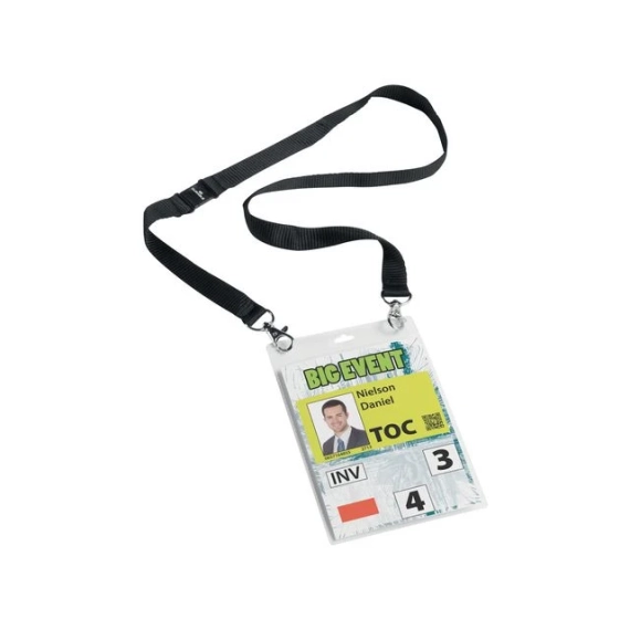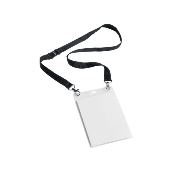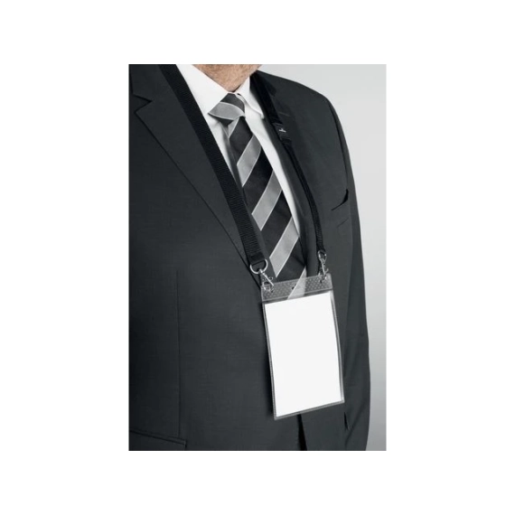 Navneskilt med ekstra stor lomme som åpnes på toppen. Kombinert med en tekstilbånd som er 2 cm bred med sikkerhetsåpning og to karabinkroker. - Doble karabinkroker gjør at skiltet ikke tvinner seg - Kan brukes med 1420 A6 - format (stående format) - Lengde: 88 mm
