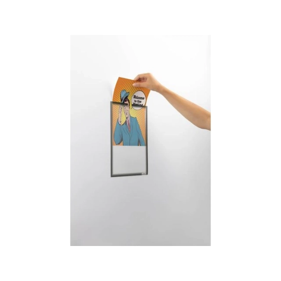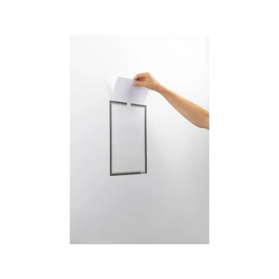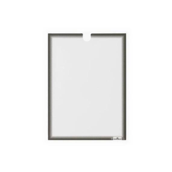 Selvklebende inforamme for A4-dokumenter: Designet for informasjon på glatte overflater innendørs. Utstyrt med 3 klebestrimler og åpning på toppen. Klebestrimlene kan enkelt fjernes etter bruk. Enkel utskifting av dokumenter med tommelgrep.