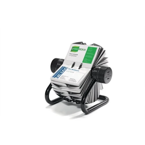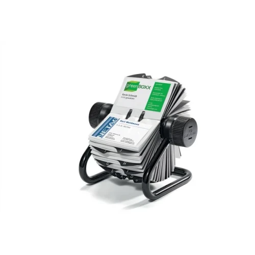 Oppbevar og se visittkort med dette praktiske og solide Visifix-visittkortkartoteket som leveres med en organiseringsindeks med faner. Hold visittkort innenfor rekkevidde med dette Durable Visifix-visittkortkartoteket som er laget av slitesterkt metall og plast. Denne enheten, som inkluderer en alfabetisk indeks i 25 deler, leveres med 200 visittkortlommer. Bruk knappene på siden av dette Durable Visifix-visittkortkartoteket til å dreie enheten og finne kontakter raskt. - ideelt for å finne visittkort raskt - inkluderer en alfabetisk organiseringsindeks i 25 deler - leveres med 200 visittkortlommer - lommene er enkle å sette i og ta ut - robust plast- og metallkonstruksjon - Farge: Svart