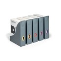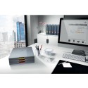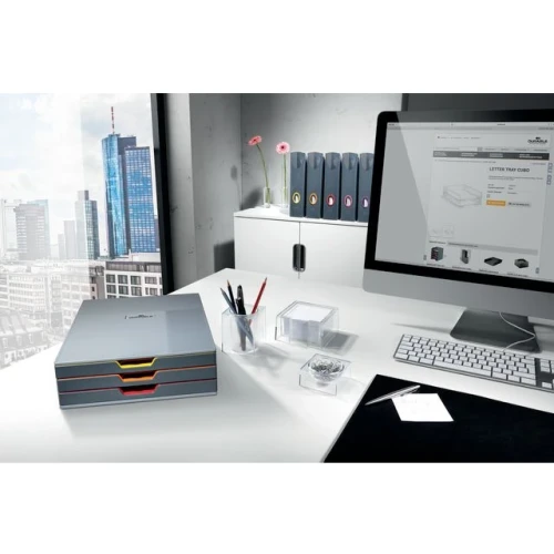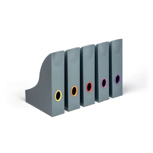 Organisering av dokumenter blir enklere med skrivebordstilbehør i moderne VARICOLOR design. Fargede konturer på produktene gir bedre oversikt. Dette settet inneholder 5 tidsskriftsamlere med gripehull i forskjellige farger for å gi enkel oversikt og håndtering. De er designet for å holde magasiner, kataloger, brosjyrer osv., og passer til A4-format. Målene på hver tidsskriftsamler er 73 x 306 x 241 mm (B x H x D).