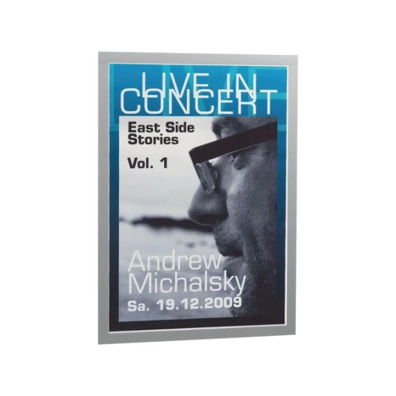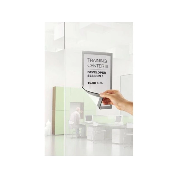 Selvklebende posterramme med magnetisk forside for bruk på glass og andre slette overflater.
