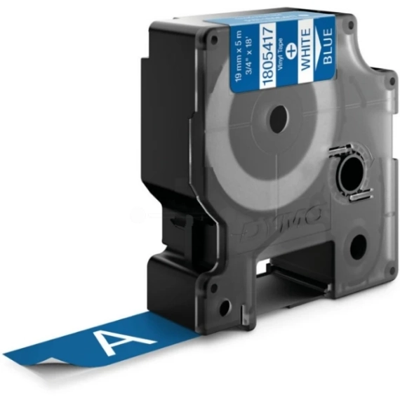 Utforsk holdbare Dymo Label Vinyl-etiketter, hvit på blå, 19mm x 5.5m, perfekt for Rhino 6000 og 5200. Bestill nå for merket presisjon.