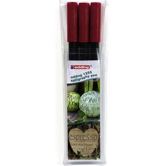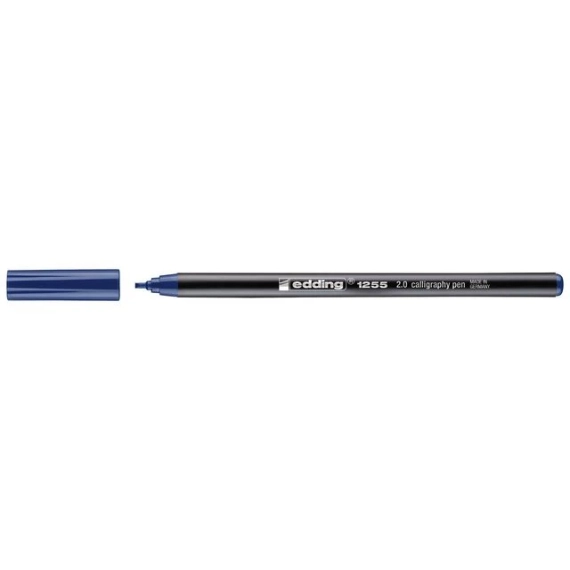 Denne kalligrafipennen bruker permanent pigmentblekk som er vann- og slitasjebestandig, noe som gjør den ideell til oppgaver som krever et blekk som ikke kan vaskes ut. Edding 1255-kalligrafipenn har en fleksibel kalligrafispiss med en strekbredde på omtrent 3,5 mm og passer utmerket til oppgaver som krever en elegant og flytende skrift. Den skriver med en svært tett lakk og har enestående vedheft, særlig på glatte, porøse og mørke overflater. Pennen kan skrive på et stort antall forskjellige overflater inklusive plast, metall, glass og treverk. Det spesielle blekket inneholder verken toluen eller xylen, noe som betyr at merkepennen ikke avgir ubehagelig lukt. Aluminiumkroppen veier lite, noe som gjør det komfortabelt og lett å skrive med denne merkepennen.