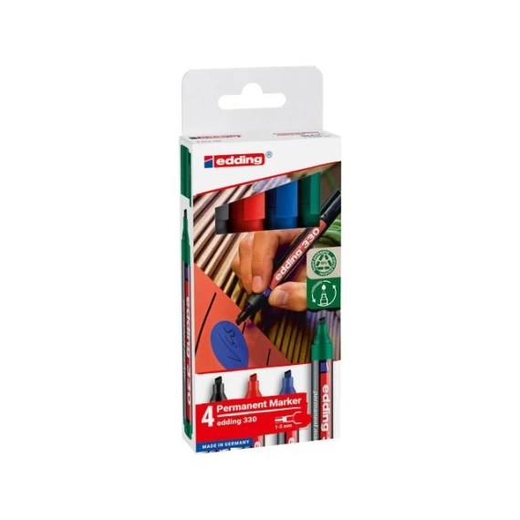 Edding 330 permanent merkepenn er utformet for mange forskjellige oppgaver og kan brukes på nesten alle overflater. Denne permanente merkepennen benytter hurtigtørkende blekk og er vann- og flekkbestandig, slik at du kan skrive tydelige og plettfrie linjer. Den er spesialutformet som en allsidig merkepenn og nyttig til en lang rekke oppgaver. Edding 330 permanent merkepenn har skråskåret spiss med en strekbredde på 1-5 mm og passer utmerket til oppgaver som krever fet og frittflytende skrift. Den skriver jevnt på nesten alle overflater, som plast, metall, glass og treverk. Merkepennen har en lett utførelse som gjør den svært behagelig og enkel å bruke. Den leveres med hette og lommeklips, slik at det er lett å ta den med seg på farten. - Permanent, hurtigtørkende, vann- og flekkbestandig blekk - Utformet for bruk til en rekke forskjellige oppgaver - Skriver på nesten alle overflater - Spisstype: Skrå - Strekbredde: 1-5mm - Luktløst blekk - Lommeklips og hette - Kan etterfylles - Farger: Sort, blå, rød og grønn - Antall: 4stk