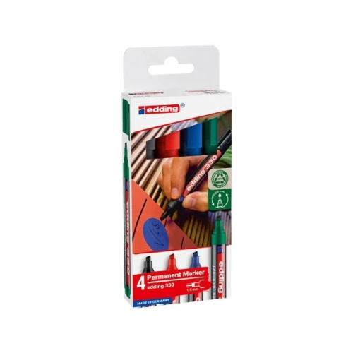 Edding 330 permanent merkepenn er utformet for mange forskjellige oppgaver og kan brukes på nesten alle overflater. Denne permanente merkepennen benytter hurtigtørkende blekk og er vann- og flekkbestandig, slik at du kan skrive tydelige og plettfrie linjer. Den er spesialutformet som en allsidig merkepenn og nyttig til en lang rekke oppgaver. Edding 330 permanent merkepenn har skråskåret spiss med en strekbredde på 1-5 mm og passer utmerket til oppgaver som krever fet og frittflytende skrift. Den skriver jevnt på nesten alle overflater, som plast, metall, glass og treverk. Merkepennen har en lett utførelse som gjør den svært behagelig og enkel å bruke. Den leveres med hette og lommeklips, slik at det er lett å ta den med seg på farten. - Permanent, hurtigtørkende, vann- og flekkbestandig blekk - Utformet for bruk til en rekke forskjellige oppgaver - Skriver på nesten alle overflater - Spisstype: Skrå - Strekbredde: 1-5mm - Luktløst blekk - Lommeklips og hette - Kan etterfylles - Farger: Sort, blå, rød og grønn - Antall: 4stk
