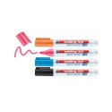 EDDING 95 glassmerkepenn gir deg fargerike og tydelige markeringer på glassflater, vinduer, glassboards og whiteboards. Den runde spissen (1,5-3mm) gir jevn skrift og tegninger, perfekt for dekorasjoner, informasjonstavler eller kreative uttrykk. Blekket er hurtigtørkende og kan enkelt tørkes bort med en tørr klut – ideelt for midlertidige notater og beskjeder. Pakken inneholder fire lyse farger, inkludert hvit, for best mulig synlighet på mørke og gjennomsiktige flater. - Fargerik og tydlig merkepenn perfekt for glass og glatte overfalter - Hurtigtørkende og tørkes enkelt av med en tørr klut - Strekbredde: 1,5-3mm - Antall: 4stk - Farge: Hvit, gul, rosa og blå