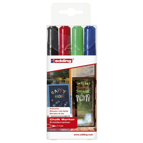Med sitt vannbaserte flytende kritt kan Edding 4095 Chalk Marker brukes på glass, vinduer, sorte tavler og speil.