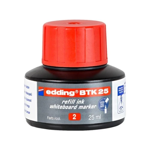 Gi dine edding whiteboard-penner nytt liv med BTK25 refill-blekk en praktisk, ren og kostnadseffektiv løsning. Bare sett pennesplitten ned i 25¿ml flasken i minst én time (helst over natten), så får du jevn og skarp skrift igjen. Finnes i klassiske farger svart, rød, blå og grønn med hurtigtørkende, lave lukt og bestående resultater. Produsert i Tyskland for høy kvalitet og pålitelighet. - Refill blekk til whiteboard-penner - Ingen butylacetat, lav lukt, hurtigtørkende - Enkel påfylling sett nib ned og vent - Volum: 25ml - Farge: Rød - Passer de fleste edding whiteboard-penner