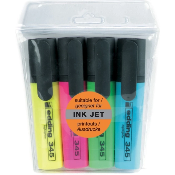 Tekstmarker Edding 345 med flat kropp skriver, streker under og merker med en frisk farge. Blekket er vannbasert og gir en dyp og sterk farge. Både teksten og merkingen synes ved kopiering. - Vannbasert blekk gir dype farger - Kan skrive på nesten alt slags papir - Skråskåret spiss til fet skrift - Strekbredde: 25 mm - Assorterte farger: Gul, rosa, blå og grønn