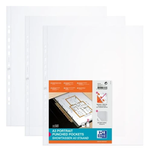 Denne perforerte A3-lommen i portrettformat er perfekt til å presentere og oppbevare planer og dokumenter i store formater. Den pregede finishen er flekkfri og anti-reflekterende, og materialet i høy kvalitet gir bedre beskyttelse. Den er transparent og utstyrt med en hvit forsterkningsstrimmel. Den er produsert i Frankrike og har plass til 25 sider. Dokumenter settes i lommen fra toppen.