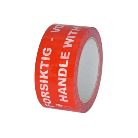 Tape med rød/hvit tekst: 'FORSIKTIG'. Emballasjetape for merking av forsendelser. Tapen har teksten 'Forsiktig' på tre forskjellige språk: Norsk / Engelsk /Tysk. - Materiale: PP med akryllim. - Mål (BxL): 50mmx 66m.