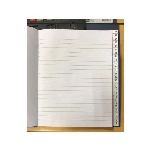 Gjennomgående register med kvart, linjer. Pappen i permen er resirkulert. - Papir i 80 g/m² kvalitet - Innbundet i hel blå shirting - Format: 17 x 21 mm