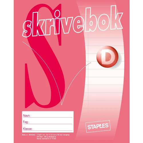 Staples skrivebok med marglinje og linjert. Norskprodusert i 80 g/m² kvalitet og i henhold til Norsk Standard (NS4150). Satinert papir (skoleskriv) motvirker gjennomslag og gir skrivevennlig overflate. - 11,5 mm linjeavstand - Format: 17 x 21 cm - Antall ark: 24 - Sertifisering: Svanemerket
