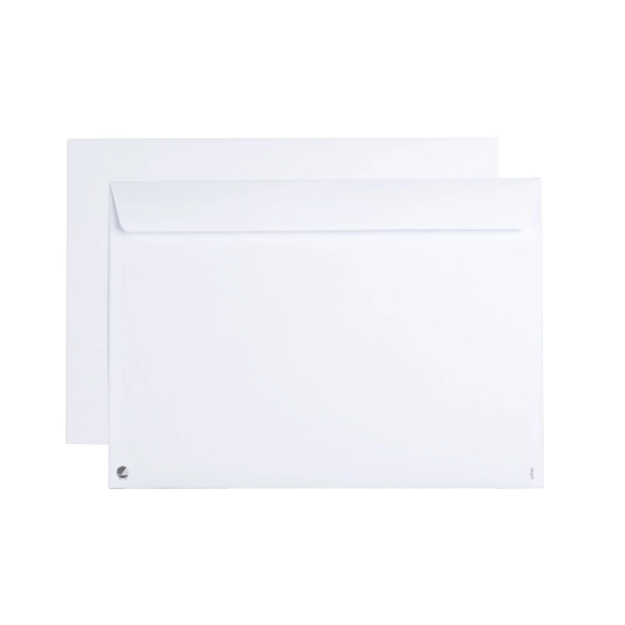 White standard envelope with grey inner print and peal&seel. C4. 229x324mm. Delivered in boxes of 500 with an easy open/shut lid. Nordic Swan.