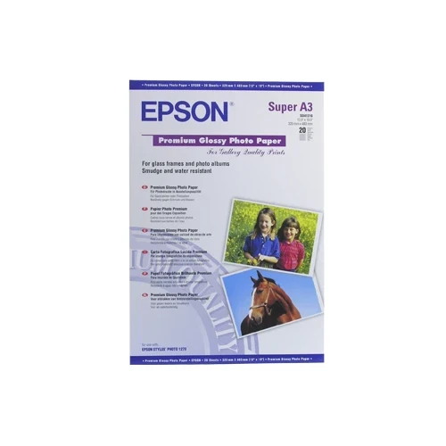A3+ Premium Glossy Photo Paper: 255g/m2 Epsons topkvalitets fotopapir har en højglans finish, som er perfekt til at printe dine favoritbilleder og forstørrelser på - for at opnå de mest ultimative resultater. Dette papir er smudsafvisende og vandafvisende med en blød, klar hvid, resin belagt overflade. Antal ark 20 Passer til følgende printere Stylus Photo: 1290 / 1270 / R1800 / 1290 / 1270 / R1400 / R1800 / R1900 / R2400