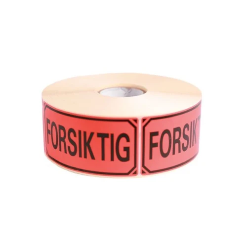 Neonfarget selvklebende etikett med sort tekst 'Forsiktig' - Mål 100x50mm, 1000 etiketter per roll.