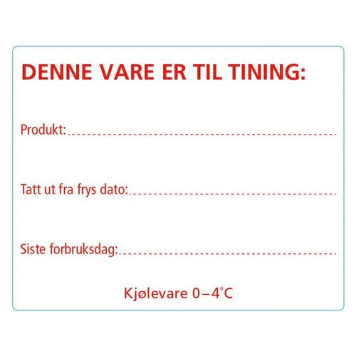 Fortrykt etikett vare til tining - Format 102x128mm, 500 etiketter pr rull. Fryselim. Kjerne: 40mm