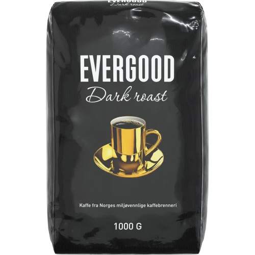 EVERGOOD Kaffe består av 100% Arabica-bønner fra Colombia, Kenya, Costa Rica, Brasil og Guatemala. EVERGOOD Dark Roast er en mørkere brent kaffe med kraftig aroma og kontinentalt preg. I frodige fjellområder høyt over havet, finnes det unike klimaet som modner kaffeplantens bønner langsomt. Slik får den fyldige, aromatiske smaksrikdommen som kjennetegner EVERGOOD Kaffe tid til å utvikle seg. En nøye utvalgt blanding der vi henter en søtlig syrlighet fra Kenya, mens bønner fra Colombia bidrar med silkemyk balanse, god fylde og en lang, elegant ettersmak.
