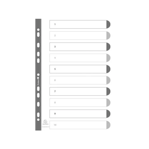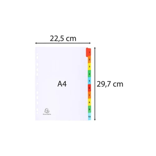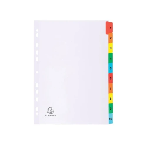 Bruk Exacompta-skillearkene til å dele opp innholdet i mappene dine i seksjoner, og finn raskt frem til dokumentene du trenger. Exacompta skillearkene har universalhulling, slik at de passer til alle typer A4-ringpermer, og hjelper deg med å ordne mappene dine pent i seksjoner i forskjellige farger. Du kan bruke flikene til å sette inn titler og raskt få tilgang til innholdet. Disse skillearkene er laget av 160 g hvit kartong med fargede forsterkede plastfaner. - Forhåndsstanset slik at de kan settes inn i filer og mapper. - Medfølger et trykt indeksark for å identifisere innhold. - Størrelse: A4. - Nummerering: 1 til 10. - Vekt: 160g.