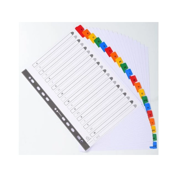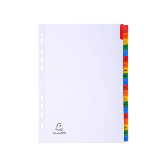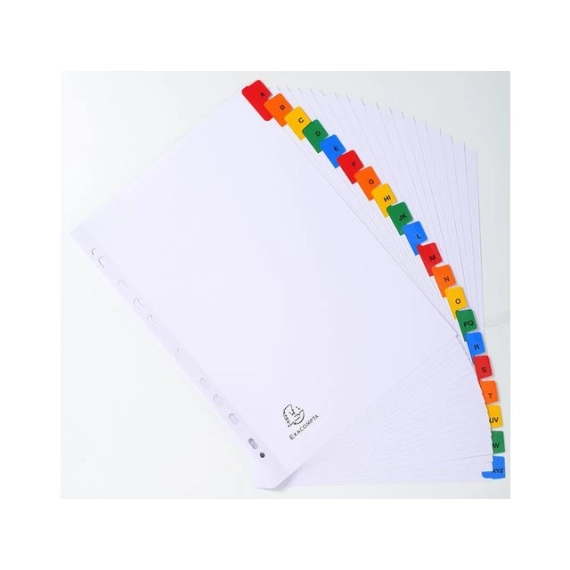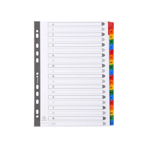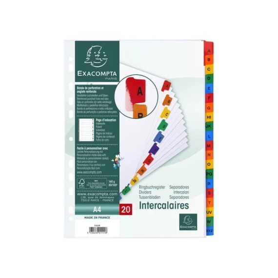 Exacompta A-Z register. Exacompta-indeksene er laget av 160gsm hvitt kort med fargede forsterkede plastfliker. Indeksene er A4 i størrelse og er forhåndstrykt med A til Å. Indeksene er forhåndsstanset slik at de kan settes inn i filer og mapper. Indeksene kommer med en trykt indeksside for å identifisere innhold. Indeksene kommer i 20 deler A til Å-faner. - 160gsm hvitt kort. - Fargede plastfliker. - A til Å forhåndstrykt.
