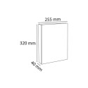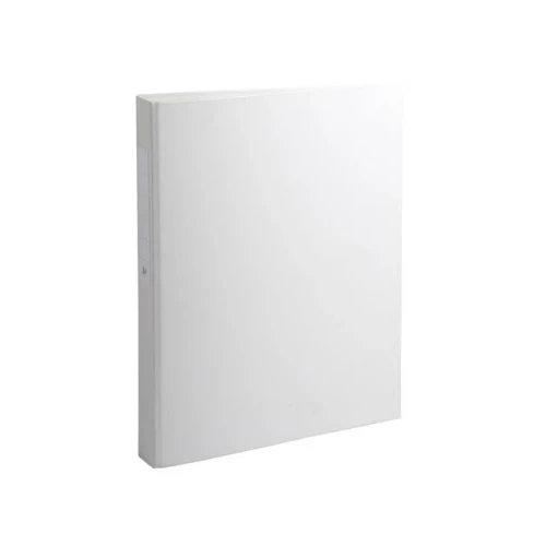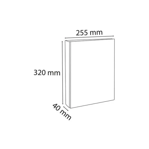 Kartong dekket med polypropylen folie innvendig og utvendig, med vendbar etikett på ryggen for merking av innholdet. - Materiale: Kartong PP dekket. - Farge: hvit. - Mål: 32x25,5 cm. - Størrelse: A4. - Ryggbredde: 40 mm. - Ringtype: O-ring. - Antall ringer: 2 stk. - Ringstørrelse: 25 mm. - Kapasitet (ark 80 g): 230 stk.