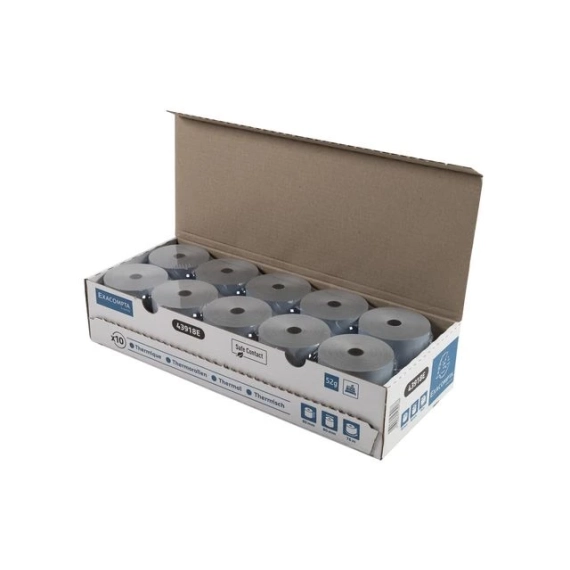 Termorull laget av et svakt blågrått papir som er motstandsdyktig mot varme, lys og fuktighet, og som garanterer et langvarig avtrykk på minimum 35 år. Våre ruller er produsert uten bruk av kjemiske utviklere, og de er BPA- og fenolfrie, noe som gjør dem trygge for helsen din. De er til og med godkjent for direkte kontakt med mat, slik at du kan være trygg på at dine transaksjoner er sikre. Vårt miljøvennlige papir er FSC-sertifiser