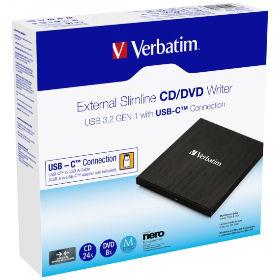 More and more notebook vendors choose to leave the optical drive out of their notebooks in favour of slim designs. Often, these notebooks replace bulkier USB-A ports with slimmer and faster USB-C ports. However, CDs and DVDs are still one of the most commonly used media types, especially for archiving all important data! The Verbatim External Slimline CD/DVD Writer with USB-C connection provides the solution - this compact device is the ideal complement for your notebook, ultrabook, netbook or even PC. Use it to install your software or to create a back-up. The Verbatim External Slimline CD/DVD Writer is barely larger than a DVD and USB powered so no need for a bulky power adapter! The drive comes with Nero Burn and Archive software which includes numerous special features including DiscSpan, MediaHome and SecureDisc Technology to help you successfully organise, burn and archive your important files. Product Details: External Slimline CD/ DVD Writer with USB-C™ connection