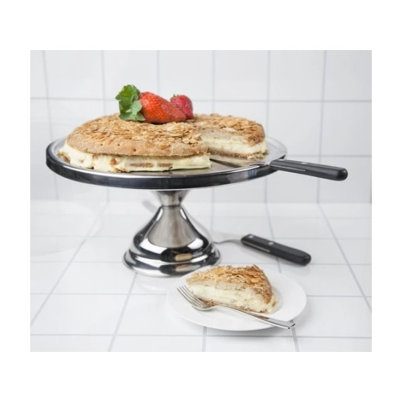 Stilrent kake-/serveringsfat på fot som gir baksten en eksklusiv presentasjon. Servering på et stettfat gir et sofistikert og profesjonelt inntrykk. Dette fatet løfter kaken eller desserten opp fra bordet, noe som gir en mer imponerende og visuelt tiltalende presentasjon. Bakverket blir bordets midtpunkt. Fatet kan brukes til mer enn bare kaker. Det er ideelt for servering av en rekke matvarer, inkludert smørbrød, ost og andre småretter. Ved å løfte serveringen opp fra bordet frigjør stettfatet plass rundt det, noe som gjør det lettere å arrangere andre matvarer og dekorasjoner. Kakefatet har en stabil fot, og er laget i rustfritt 18/0 stål med lang levetid. For ekstra beskyttelse og estetikk kan du kjøpe et matchende lokk separat, som gjør det enkelt å både oppbevare og vise frem baksten. - Kakefat som kombinerer funksjonalitet og stil, perfekt for å gi dine kaker og desserter en elegant presentasjon - Materiale: Rustfritt stål - Mål: (LxBxH) 33,5x33,5x17,2cm - Vekt: 1,025kg - Inneholder kun kakefatet, tilhørende lokk kan bestilles separat