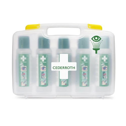 A portable case containing 5 Cederroth Eye Wash, 500 ml. The five Cederroth Eye Wash bottles are protected against dust and moisture in the durable semi-transparent plastic case with a solid handle. The case is easily opened by pushing the sturdy yellow opening buckles sideways. The space between the bottles provides an easy grip on the Cederroth Eye Wash bottles. The Cederroth Eye Wash is intended for washing away foreign particles and dangerous liquids, like alkali or acids, from an eye in an emergency first aid situation at the workplace. The Cederroth Eye Wash is intended for the first acute phase at the very accident site before getting to a plumbed or self-contained eye wash equipment or seeking medical attention.The portable case is intended for mobile workplaces and continuous irrigation during transport to the hospital. Storage informationStore in temperatures between +2°C and +40°C. For maximum protection, store in the original packaging until the time of use.