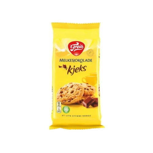 Freia Melkesjokolade kjeks - en sprø og god kjeks, fylt med biter av deilig Freia Melkesjokolade -'Et lite stykke Norge'. Nytes når du skal kose deg sammen med andre, eller ønsker noe søtt til kaffen, og passer for hele familien. - Allergener: gluten, soya, melk - Ingredienser: Hvetemel, melkesjokolade 25 % (sukker, tørrmelk, kakaosmør, kakaomasse, emulgator (soyalecitin), aroma (etylvanillin)), palmeolje, sukker, hevemidler (ammoniumhydrogenkarbonat, natriumhydrogenkarbonat, dinatriumdifosfat), salt, aroma, fargestoff (betakaroten). - Vekt: 184g.