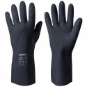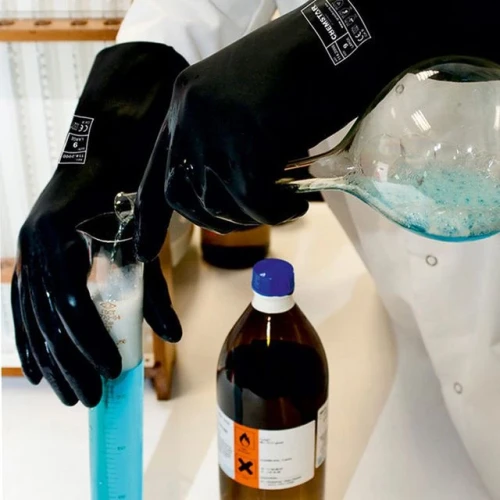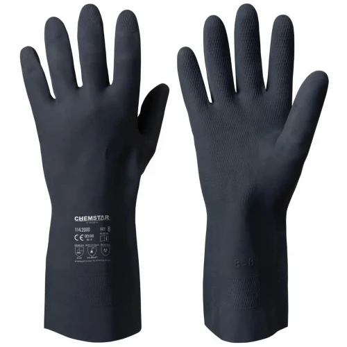 Kjemikaliehansker Granberg 2000 i neopren. Fôr av bomullsfloss. Inneholder lateks Slitesterke Høy kjemikaliebestandighet Glidesikkert mønster gir godt grep under våte og tørre forhold Flossfôr i ren bomull for å absorbere svette Passer til: Bilindustrien, kjemisk industri, industrielt renhold, oljeraffinering Farge: Sort Tørrgrep, våtgrep Lengde: 30cm Tykkelse: 0,75mm Flossfôret Materiale: Neopren Standarder og merking: EN 388:2016+A1:2018, EN ISO 21420:2020, EN ISO 374-1:2016+A1:2018/Type A, EN ISO 374-5:2016